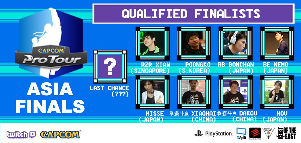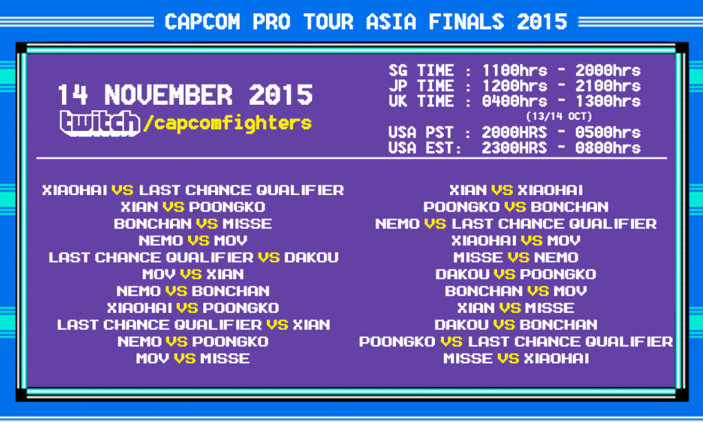 The Capcom Pro Tour Asia Finals is finally almost here! Throughout the year, many of Asia’s top players have been earning qualifying spots to this, the next to last Premier Tournament of the season! On the line is one of the last two automatic qualifying spots to Capcom Cup 2015! Note that no Ranking Points are being rewarded for the remainder of the season. This event also exciting in that its format is unique in all of the Capcom Pro Tour Season. This event isn’t a standard double elimination bracket. It’s a round-robin format, so all players will have a chance to face off against every other player to earn 1st place! Be sure to watch all the action live on the stream!